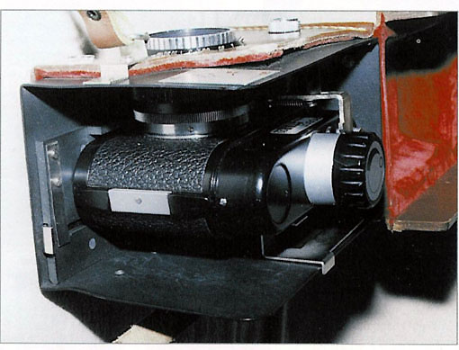 Es ist eine vom OTS geräuschgeminderte Version, wie man an der Haube rechts erkennen kann. Der Transportvorgang bei der normalen Version ist recht laut. RoBoT bietet eine eigene geräuschgeminderte Version an, aber gegen Aufpreis. Links ist der vom OTS entwickelte Sondermagnet S 30 befestigt, der eine elektrische Auslösung gestattet. Die Objektivfassung ist abgedreht, um möglichst dicht an die Öffnung der Tarnung heranzukommen.