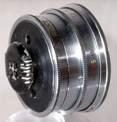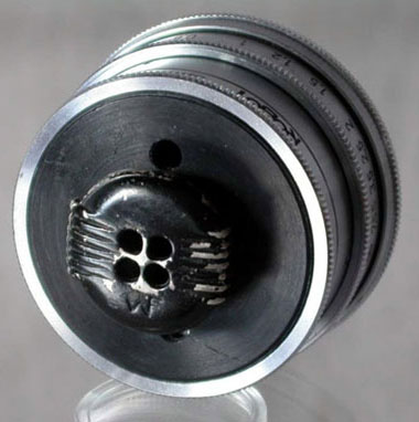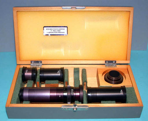 Stasi Nadelobjektiv in einer Holzschatulle mit Adapter für RoBoT Schraubanschluß 26 mm und einigen Verlängerungen. Mit diesem Objektiv wurde durch Zimmerwände fotografiert. Die Objektivöffnung beträgt einen Millimeter.