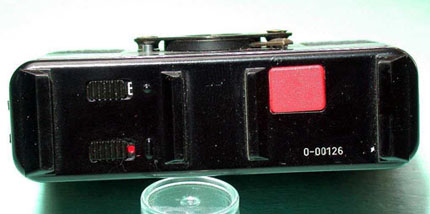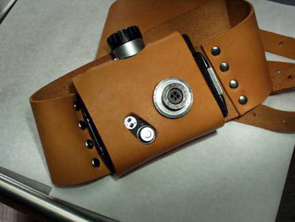 Das Objektiv befindet sich hinter dem Infrarotfilter im Verschluss, die beiden Blitzreflektoren blitzen unsichtbar durch das IR-durchlässige Kunstleder. Ausgelöst wird mit den Schaltern auf der Oberseite.
