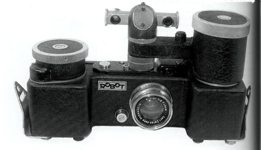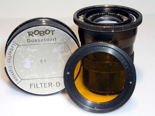 Der Luftwaffen-RobotWährend des 2. Weltkriegs setzte die deutsche Luftwaffe den Robot II in Flugzeugen zur Aufklärung oder zur Schusskontrolle ein, da er weitgehend rüttel- und kältefest war und „automatisch“ arbeitete. Verwendet wurde in der Regel ein schwarzes Gehäuse mit doppeltem Federwerk und einem schwarzen Tele-Xenar 75 mm. Alle Gehäuse und Objektive wurden mit „LUFTWAFFEN EIGENTUM“ graviert und die Kameras erhielten ein F (für Flieger) als Kennbuchstaben vor der Seriennummer. Nach dem Krieg wurde die Gravur „LUFTWAFFEN EIGENTUM“ oft entfernt. Die Fa. Robot bot den Besitzern des noch in großer Anzahl vorhandenen “Luftwaffen Robot” den Umbau in Standardmodelle II an. Hierbei wurden die oberen Teile gegen verchromte ausgewechselt und das Unterteil neu schwarz lackiert. Umbauzeit ca. 3 Wochen. Die unter dem Gehäusedeckel verarbeiteten Teile waren entgegen ihren zivilen Schwestern schwarz ausgeführt.