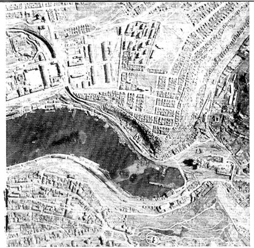 Die unten gezeigten Luftaufnahmen sind von rechts nach links zu lesen. Hier wir der Hafen vor dem Bomben-Abwurf, beim explodieren der Bomben und das erzielte Ergebnis gezeigt.